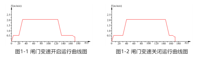 閘門啟閉根據(jù)閘門的運行阻力矩特點,采用無級變速,并符合“慢—快—慢”的要求。閘門以0.6m/min ~ 2.1m/min ~ 0.6m/min ~ 0.4m/min三種速度,參考下列曲線運行,閘門開啟時的運行曲線,可按下圖1-1控制;閘門關閉時的運行曲線,可按下圖1-2控制,全程運行時間約為170s左右。具體應根據(jù)閘門的實際受力情況作調(diào)整。